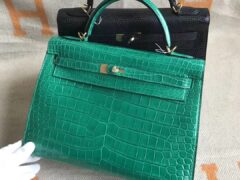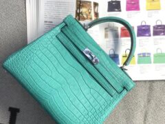 エルメスケリー32CM6Qエメラルドグリーンシャイニークロコダイルレザーゴールドバックル