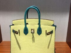 エルメスカラーブロックプラチナバッグエルメスバーキン25CMC9グースイエロー/7Fピーコックブルーゴールドバックル