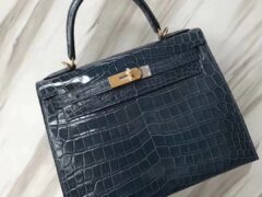 スポットエルメスエルメスシャイニークロコダイルレザーミニケリーミニケリーバッグハンドバッグ7Nストームブルーゴールドバックル