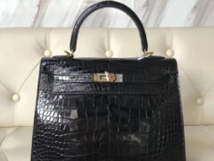 エルメスケリー25CMエルメスCK89ブラックシャイニークロコダイルレザーアウターシームケリーバッグゴールドバックル
