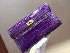 エルメスレディースウォレットエルメス輸入光沢クロコダイルレザーケリーウォレットハンドバッグ5Lエクストリームパープルゴールドバックル