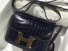 エルメスコンスタンス18CMエルメス7Kサファイアブルーシャイニークロコダイルレザーコンスタンスバッグゴールドバックル