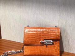 エルメスVerrou17.5CMエルメス9Jフレームオレンジ光沢のあるクロコダイルレザーピストルバッグシルバーバックル
