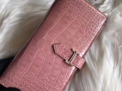 広州白雲皮具城エルメスエルメスピンクの光沢のあるクロコダイルレザーHバックルベアンウォレットスーツクリップシルバーバックル