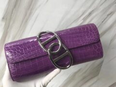 エルメスエゲエルメスローズレッドパープルシャイニークロコダイルレザーピッグノーズクラッチイブニングバッグロングウォレットシルバーバックル
