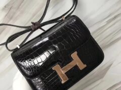 エルメスコンスタンス18CMエルメスck89ブラックシャイニークロコダイルレザースチュワーデスバッグローズゴールドバックル