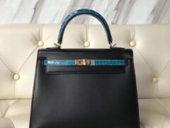 エルメスケリーバッグレザー付きエルメスケリー25CMCK89ブラックボックスレザー7Wイズミールブルークロコダイルレザーゴールドバックル付き