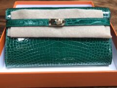 エルメスケリーウォレット6Qエメラルドグリーンシャイニークロコダイルレザーイブニングクラッチゴールドバックル