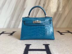 エルメスミニケリー-27Wイズミールブルーシャイニークロコダイルレザーミニケリーバッグ2世代シルバーバックル