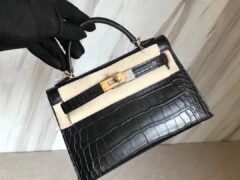 エルメスミニケリー-2エルメスCK89ブラックマットクロコダイルレザーミニケリーバッグ2世代ディナーバッグゴールドバックル
