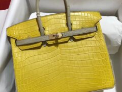 エルメスカラーブロックプラチナバッグエルメスバーキン25CM9Rレモンイエロー/8Lクリームホワイトマットクロコダイルレザーゴールドバックル