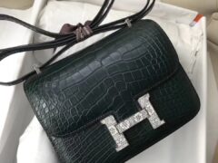 エルメスコンスタンス18CM1Tタイタングリーンマットクロコダイルレザースチュワーデスバッグリザードシルバーバックル
