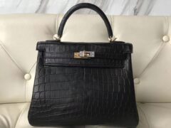 エルメスケリー25CMエルメスブラックマットナイルクロコダイルスキンケリーバッグゴールドバックル付き