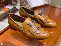 エルメスの新しいレディースシューズエルメスゴールデンブラウンシープスキンHバックルタッセルローファーフラットシューズ35-41