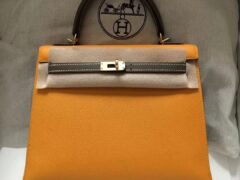 エルメスカラーブロックケリーバッグエルメスケリー25CM9Vサンイエロー/ck18エレファントグレーエプソムレザーゴールドバックル