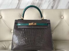 エルメスカラーブロッキングケリーバッグエルメス光沢のあるクロコダイルスキンKelly25CMCK81タートルドーブグレー、6Qエメラルドグリーンゴールドバックル