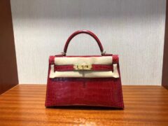 エルメスミニケリー-2エルメスCK95フェラーリレッドシャイニークロコダイルレザーミニケリーバッグ2世代ゴールドバックル