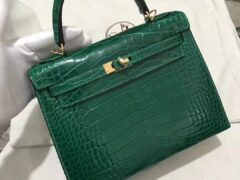 スポットエルメスケリーレディースバッグエルメスシャイニークロコダイルレザーアウターシームケリーバッグ25CM6Qエメラルドグリーンゴールドバックル