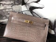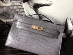 エルメスMinikelly22CMライトグレーシャイニークロコダイルレザーミニケリークラッチゴールドバックル