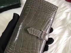 ファクトリーダイレクトエルメスエルメスシャイニークロコダイルレザーHバックルベアンウォレットカードホルダーグレーシルバーバックル
