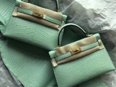 スポットエルメスミニケリー2世代ハンドバッグエルメスマットクロコダイルレザーミニケリーバッグ2世代6Uミントグリーンゴールドバックル