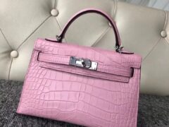 スポットエルメスミニケリー2世代ミニケリーバッグエルメスマットクロコダイルレザークラッチ5Pチェリーパウダーシルバーバックル