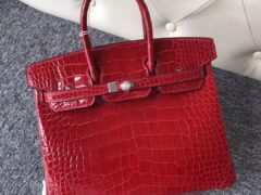 スポットエルメスバーキン25CMエルメスCK95フェラーリレッドシャイニークロコダイルレザープラチナバッグシルバーバックル