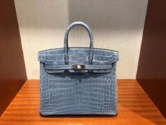 スポットエルメス手縫いプラチナバッグエルメスバーキン25CMCK75デニムブルーシャイニークロコダイルレザーシルバーバックル