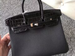 エルメスタッチシリーズプラチナバッグBirkin25CMck89ブラッククロコダイルレザーとトーゴレザーローズゴールドバックル