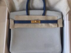エルメスバーキン25CMエルメスグレイシャーブルーとサファイアブルーシェブルゴートレザーカラーブロックプラチナバックル