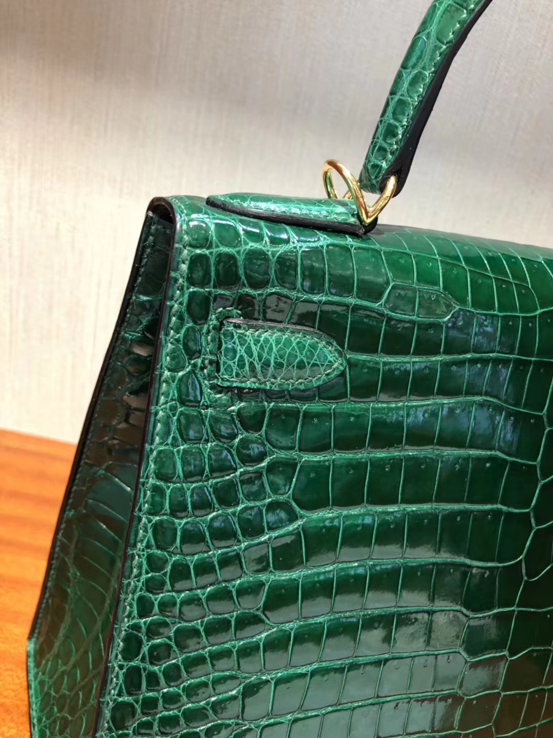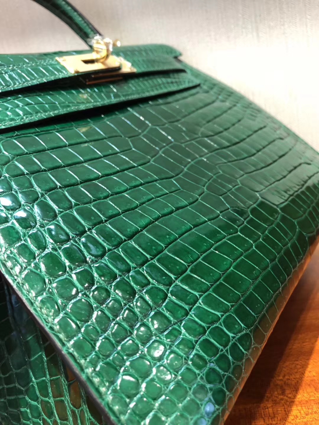 ブランド:エルメス;スタイル:アウターシーム付きケリーバッグ;素材:オリジナルの光沢のあるクロコダイルレザー;カラー:CK67エメラルド;サイズ:28cm;ハードウェア:ゴールドバックル;付属品:ダストバッグ、ロック;用途:ハンドバッグ