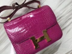 スポットエルメスクロコダイルレザーレディースバッグエルメスシャイニークロコダイルスキンコンスタンスバッグ24CMJ5アラビアンナイトピンクパープルゴールドバックル