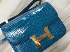 スポットエルメススチュワーデスバッグクロコダイルレザーエルメスコンスタンス24CM7Wイズミールブルーゴールドバックル