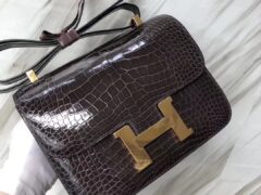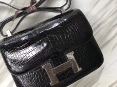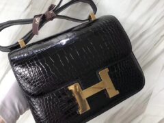 スポットエルメスコンスタンス24CMエルメスCK89ブラックシャイニークロコダイルスキンコンスタンスバッグゴールドバックル