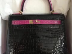 エルメスケリーバッグエルメスケリー28cmCK89ブラックとJ5アラビアンナイトピンクパープル光沢のあるクロコダイルレザー