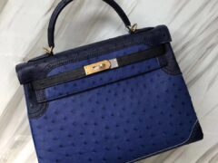 エルメスレースケリーバッグオーストリッチレザーエルメスギリーKelly32CMエレクトリックブルーカラーブロックゴールドバックル