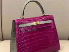 スポットエルメスカラーブロッキングケリーバッグエルメスクロコダイルレザーJ5アラビアンナイトパウダーパープルスペリングCK81タートルドーブグレーケリー25cmゴールドバックル