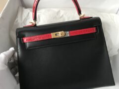 スポットエルメスケリー25CMエルメスck89ブラックボックスレザー/CK95フェラーリレッドクロコダイルスキンケリーバッグゴールドバックル