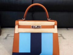 エルメスカラーブロックケリーバッグエルメスケリー28CMフレイムオレンジ、アンバーイエローとミッドナイトブルーシルバーバックル