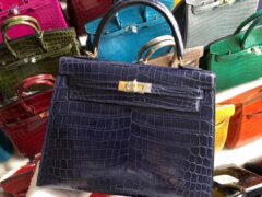 スポットエルメスケリーバッグエルメスケリー25CMM3インクブルー光沢クロコダイルスキンケリーバッグゴールドバックル