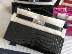 スポットエルメスミニケリーハンドバッグエルメスシャイニークロコダイルレザーミニケリーバッグCK89ブラックシルバーバックル