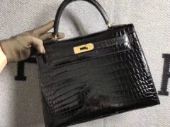 エルメスケリーバッグエルメスケリー28CM光沢のあるクロコダイルスキンケリーバッグブラックゴールドバックル