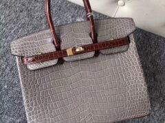 エルメスカラーブロックプラチナバッグエルメスクロコダイルレザーBirkin25CMCK81タートルドーブグレー、CK31ハニーブラウンゴールドバックル