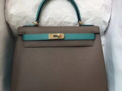 エルメスケリー28CMエルメスエレファントグレーとピーコックブルーエプソムレザーケリーバッグゴールドバックル