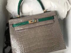 エルメスカラーブロッキングケリーバッグエルメス光沢のあるクロコダイルスキンKelly25CMCK81タートルドーブグレー、6Qエメラルドグリーンゴールドバックル