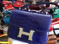 スポットエルメスコンスタンスバッグエルメスシャイニークロコダイルスキンコンスタンスバッグ18CM7Tエレクトロオプティカルブルーシルバーバックル