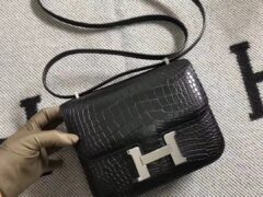 エルメスコンスタンス19CMエルメスブラックオリジナルアメリカンクロコダイルレザースチュワーデスバッグシルバーバックル