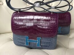 エルメスカラーブロックスチュワーデスバッグエルメスコンスタンス18CMガレンパープル/デニムブルー/イズミールブルークロコダイルレザークロコダイルバックル