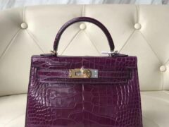 エルメスディナーハンドバッグエルメスミニケリー-2世代N5ガロンパープルシャイニークロコダイルレザーミニケリーバッグ2世代ゴールドバックル