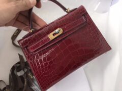 エルメスミニケリー2世代エルメスF5ライトワインレッドシャイニークロコダイルレザーミニケリーバッグゴールドバックル